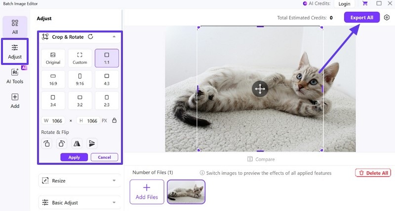 Click on the Crop & Rotate tab. And choose any angle you want under "Rotate & Flip" tab. If satisfied, tap on "Apply" and "Export All" to save all rotated images.