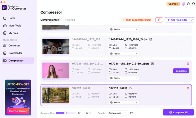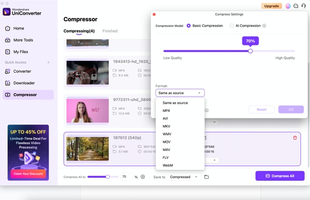 The Compressor tool in UniConverter supports a wide range of multimedia formats, including MP4, MOV, AVI, MKV, MP3, WAV, and more. Whether you’re working with video, audio, or even images, UniConverter ensures that you can compress files in various formats without hassle. This versatility makes it a one-stop solution for all your file compression needs.