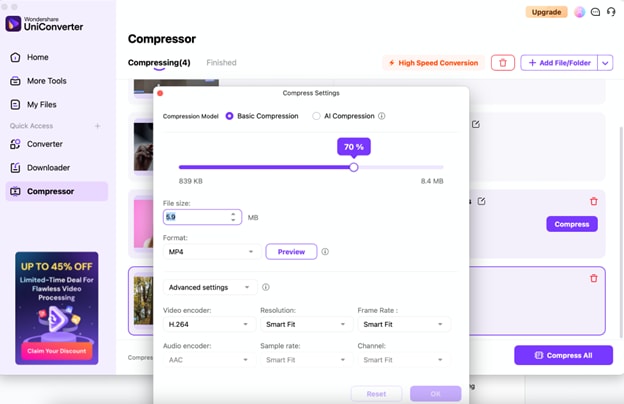 With UniConverter, you can adjust compression settings according to your specific needs. You can select the bitrate, resolution, and file size for your videos, ensuring that you get the perfect balance between quality and size. This customization is especially useful when working with files that need to meet specific size requirements for uploading or sharing.