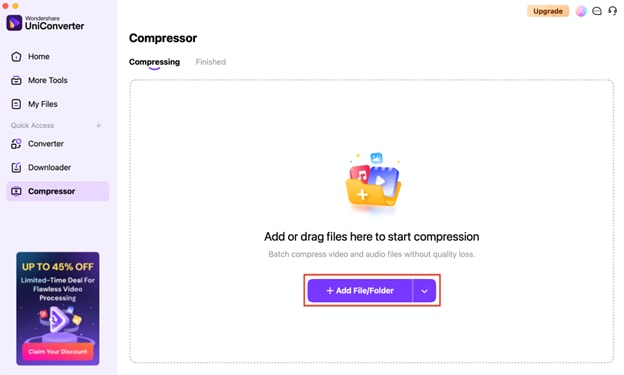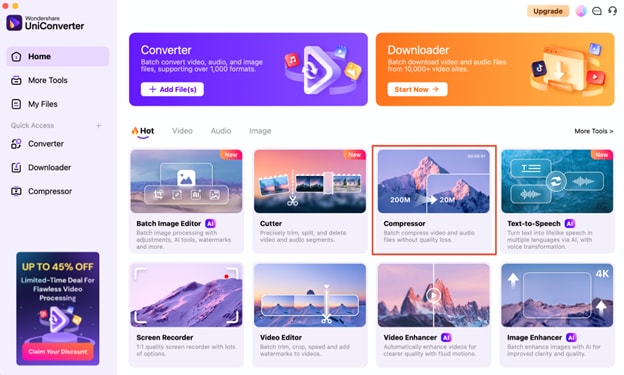 Open UniConverter, and navigate to the Compressor tab. This will allow you to access all compression features, whether you want to reduce video or audio file sizes.
