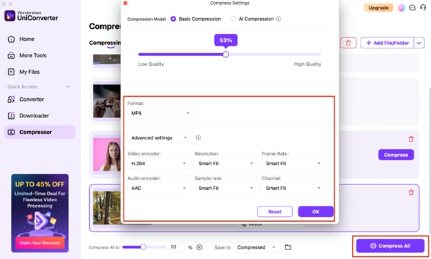Select the desired output format and compression settings (bitrate, resolution, etc.) based on your needs. Once done, click Compress All to begin compressing your files. After completion, your files will be saved in the desired location.