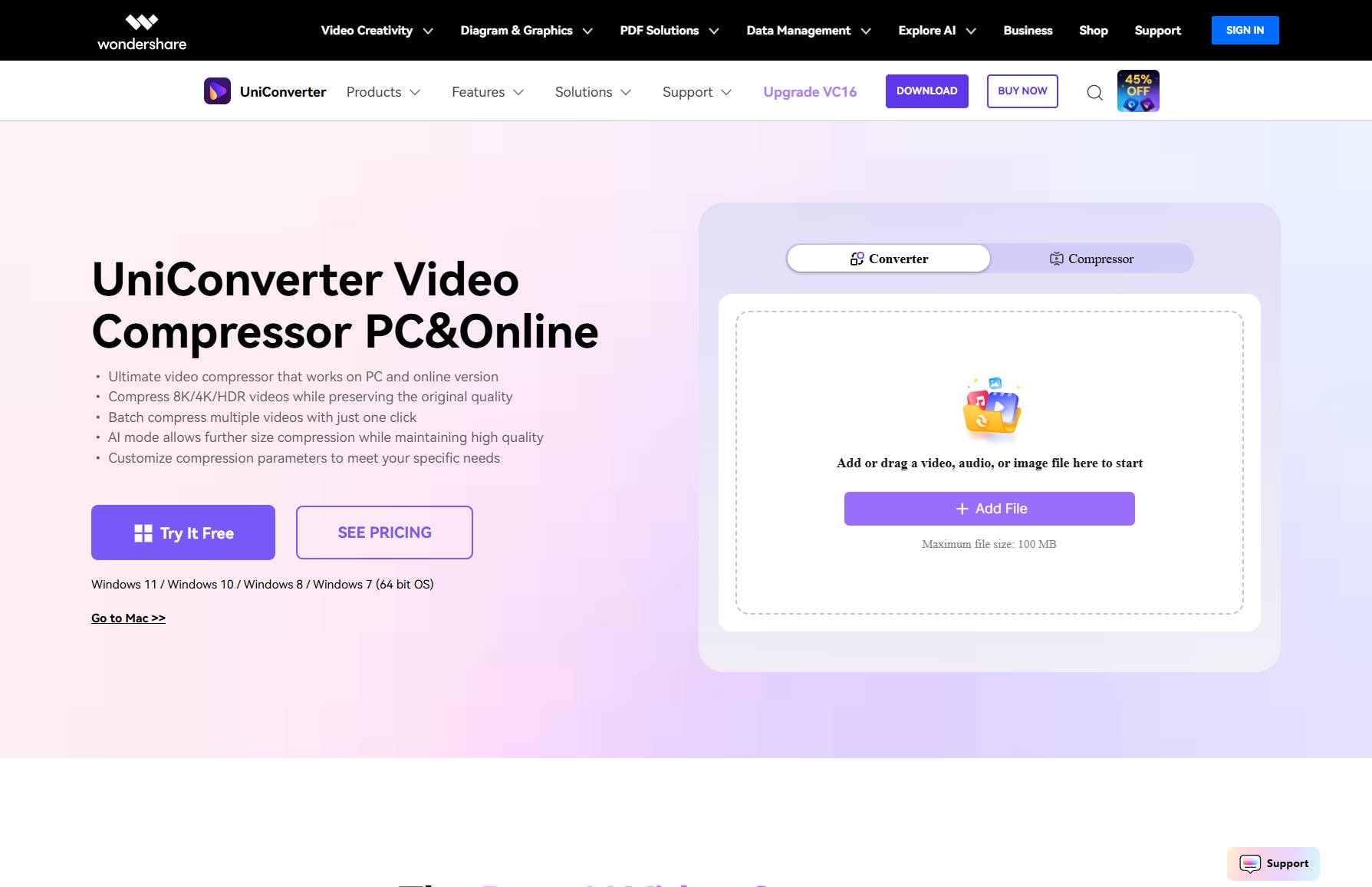 UniConverter's compression tool reduces large video files to more manageable sizes without sacrificing quality. This function is essential for faster uploads and sharing while maintaining high-definition visuals. It supports various file formats, so your media can be compressed and optimized for all your devices.