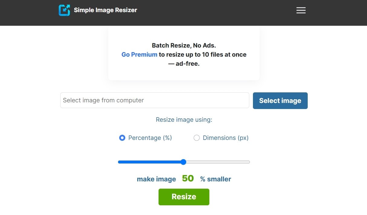Creators and photographers can turn to online sources if they want a convenient and quick solution. Try using Simple Image Resizer, where you can crop image online without losing quality. It offers two methods of resizing, which are both adjustable: percentage and dimensions. Additionally, you can use this tool on Android and iOS and crop image without losing quality online by following the given steps: