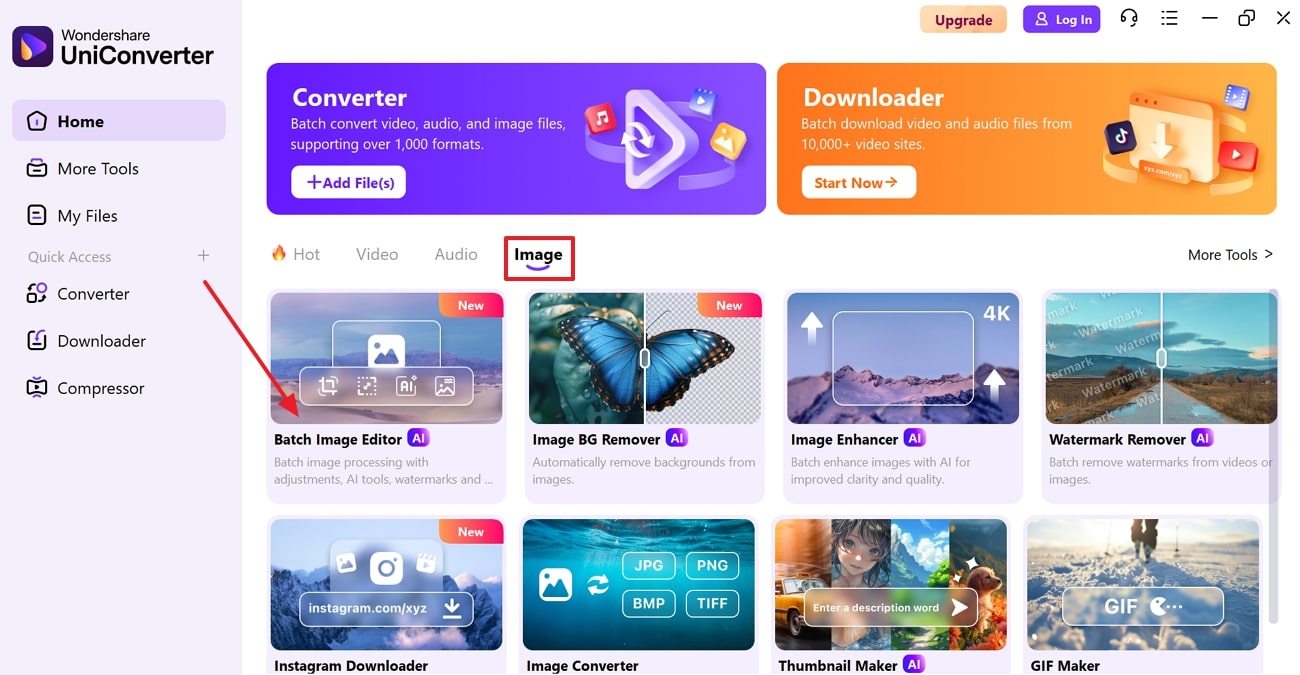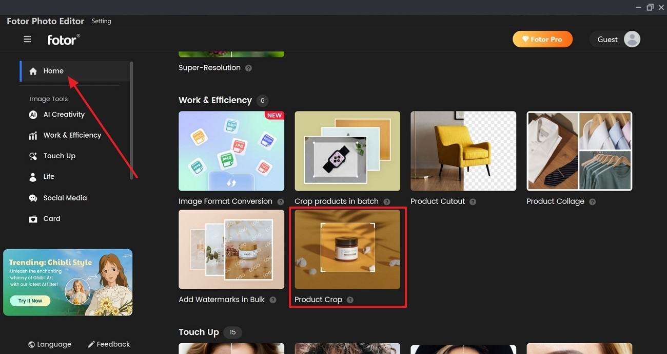 Step 1. From the “Home” tab, scroll down and click the “Product Crop” under the “Work & Efficiency” section. When the dialogue box appears, import the image you want to resize and continue.