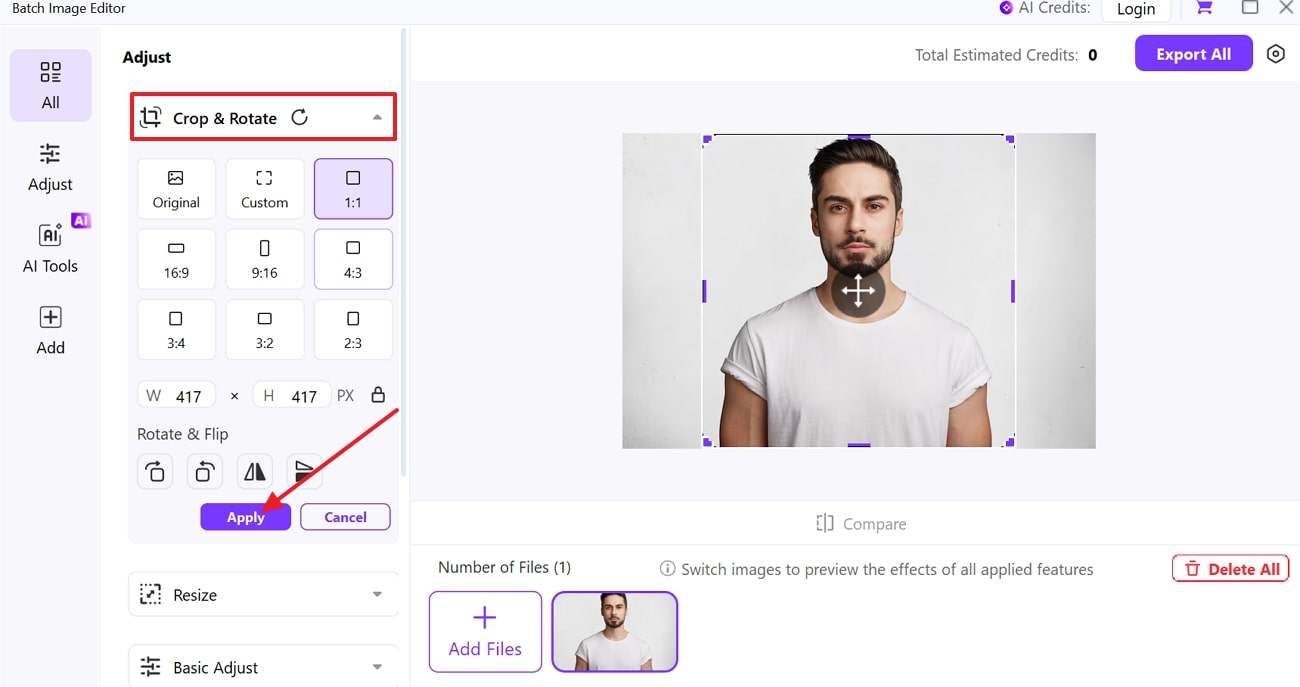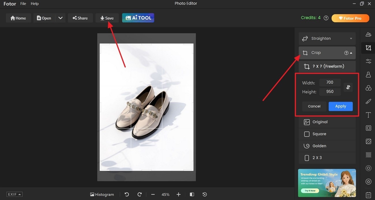 Step 2. Go to the right panel and adjust the “Height” and “Weight” of the image under the “Crop” section. Next, hit the “Apply” button and press “Save” at the top menu bar.