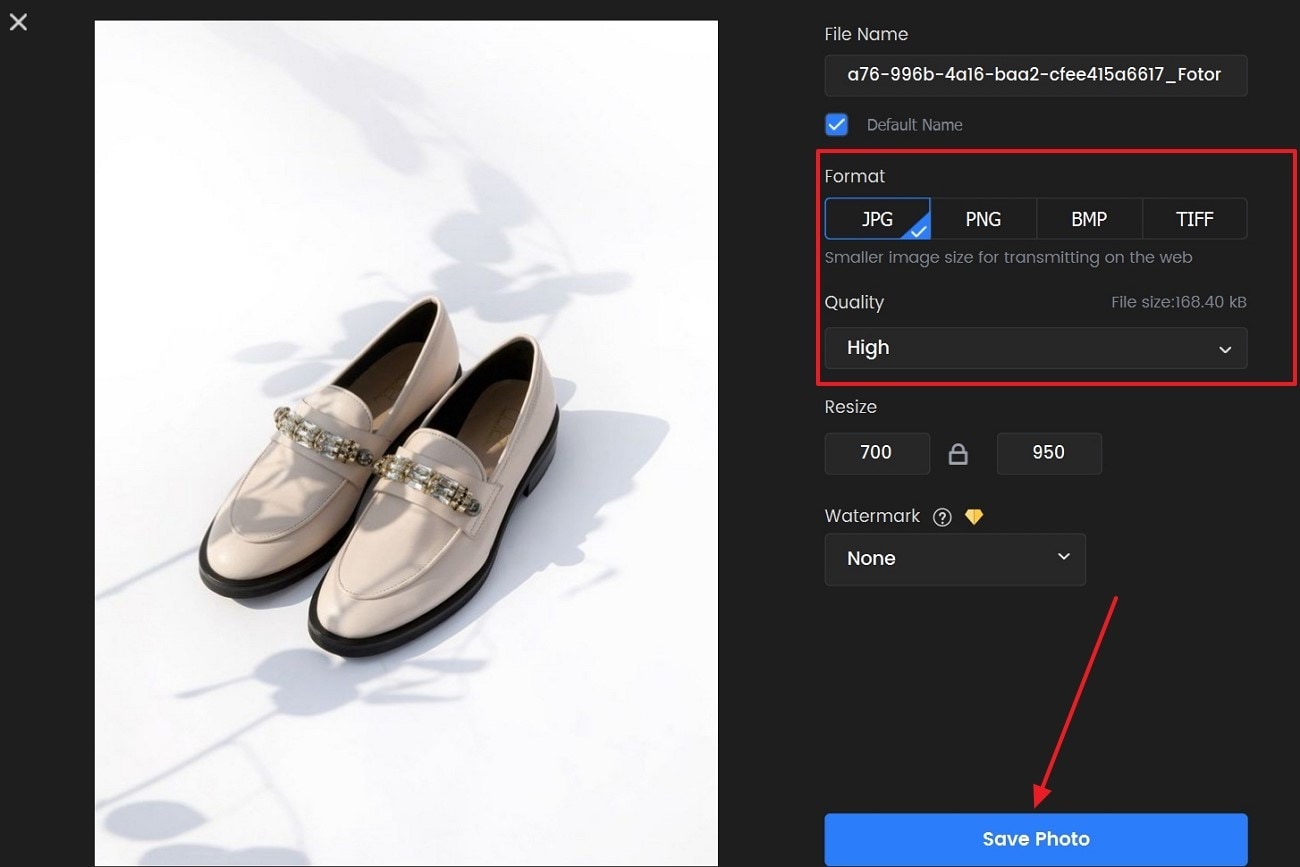 Step 3. On the “Save” dialogue box, choose the “Format,” “Quality,’ and “Watermark” options. When satisfied with the choices, click the “Save Photo” button at the bottom right.