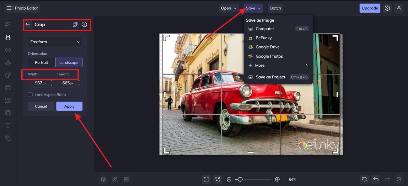 Step 1. Search the tool and press the “Upload Your Images” button to add a photo. Step 2. From the “Aspect Ratio” select the desired template to crop the photo and hit the “Download” button. Another online tool on the list is BeFunky, which offers orientation to crop the image in Portrait and Landscape modes. The user can select the height and width of the image and cut it short according to their desired needs. Moreover, the “Aspect Ratio” expanded list allows you can select pre-made ratios such as Golden Ratio, Cinema, Facebook, etc., according to the platform you are planning to upload. 1. The tool offers other features like AI Enhancement, which automatically improves the pictures. 2. With the color tool, you can turn your photos vivid and bright. 3. It offers a cutout that instantly removes an unwanted object from the images. 4. You can reverse the editing procedure if you accidentally make a mistake. Step 1. Access the tool and click the “Get Started” button to upload an image. Step 2. Now, under the “Crop” section, change the “Width and Height” and press the “Apply” button. Then, click the “Save” button to select the desired place where you want to download the image. m26prea902 265MB.33425MB.p ca7 29.0 If 14.312ce391 hn .9027,u14.3may2ne391 2 2304 21.2.211pdth="oei9.th="2.334461 4 2miumB6 34