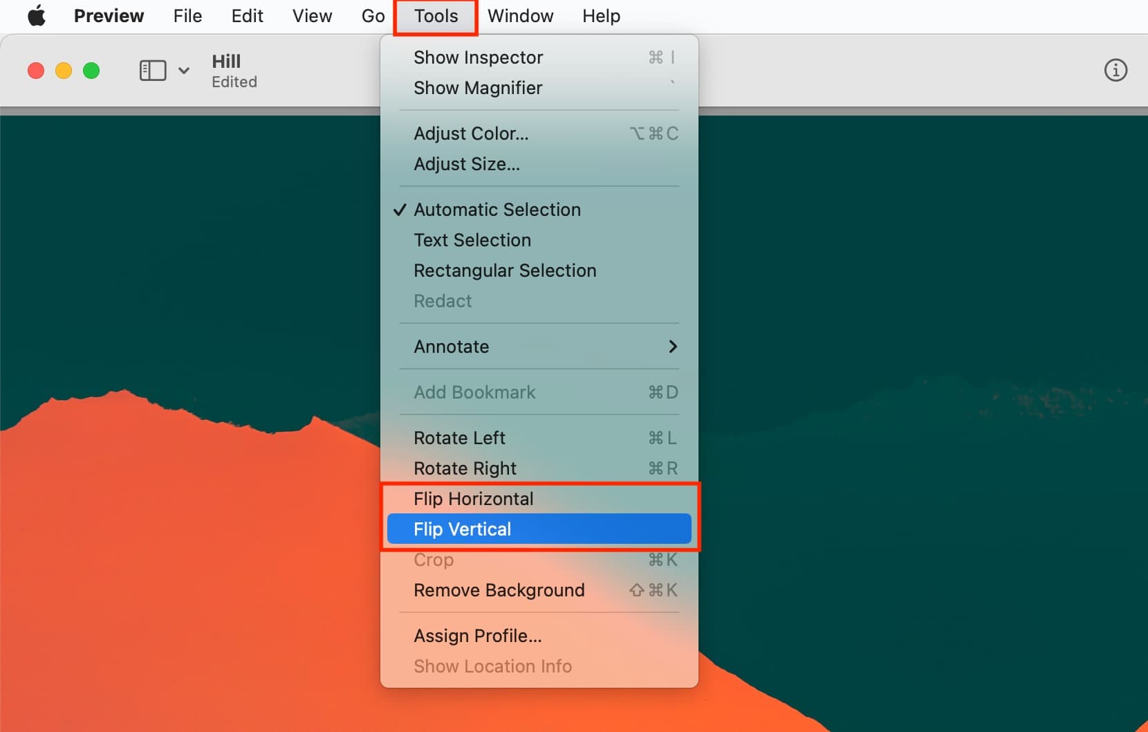 - Locate your image in Finder and double-click to open it in Preview. Click on "Tools" in the top menu. Select "Flip Horizontal". This will mirror the image left to right.