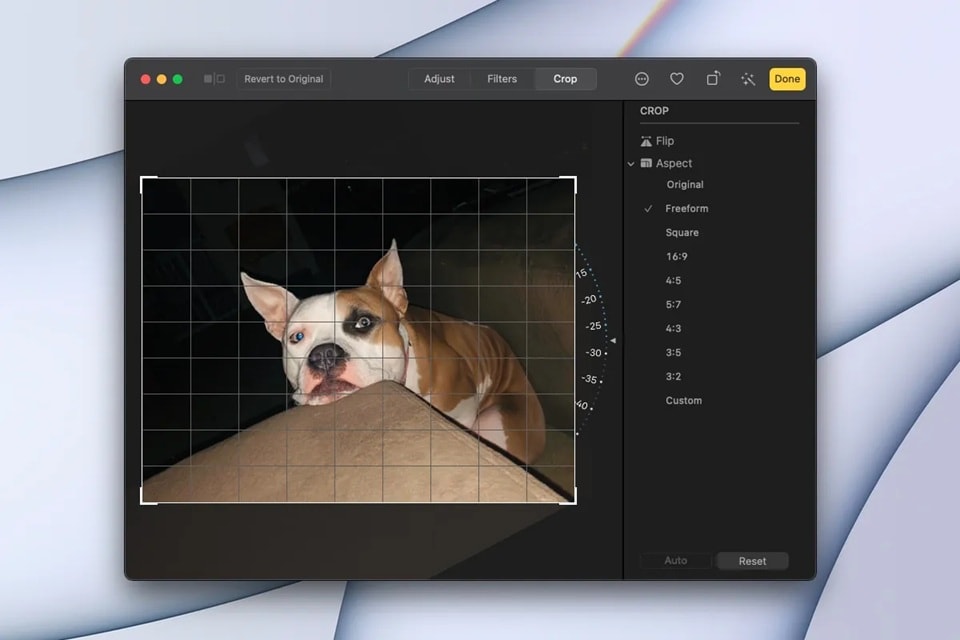 - Hold the Option key while clicking to rotate counterclockwise. For fine adjustments, use the straighten tool under "Crop". Click "Done" to save your changes
