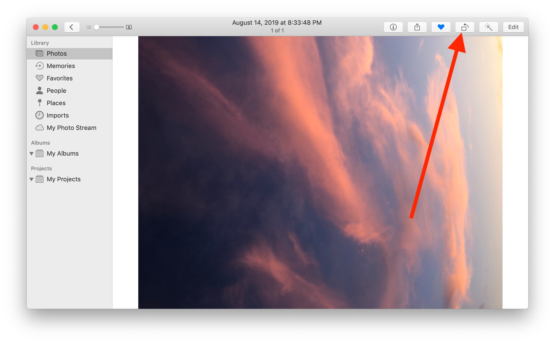 - Open Photos app and select your image. Click "Edit" in the top right corner. Find the rotate icon (curved arrow) in the toolbar. Click it to rotate your image 90 degrees clockwise.