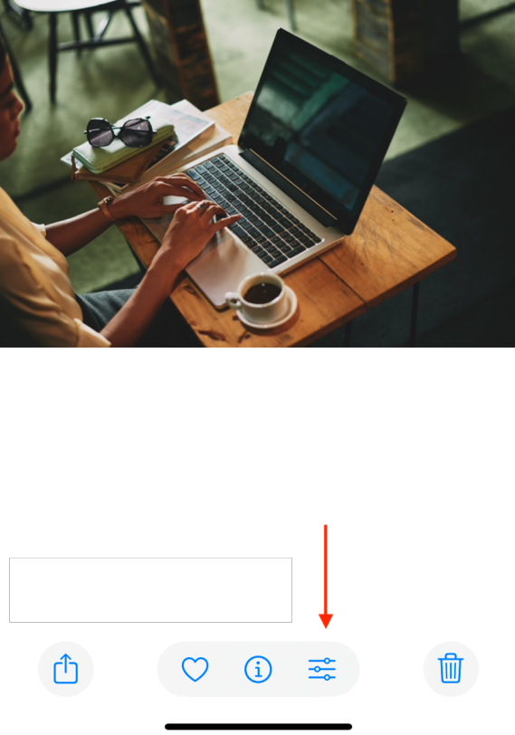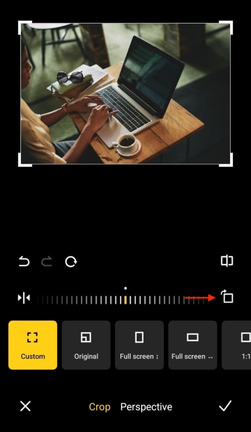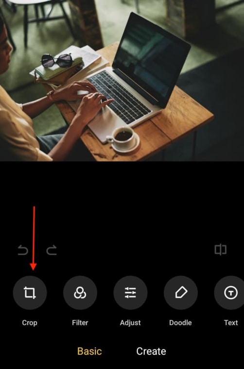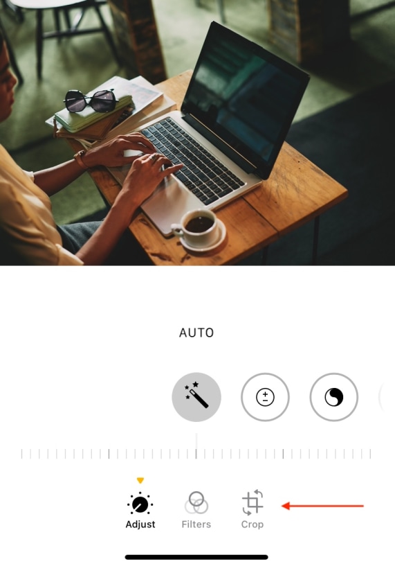 Within the editing interface, tap the “Crop” icon at the bottom right side of the screen. The icon looks like a square with overlapping arrows.
