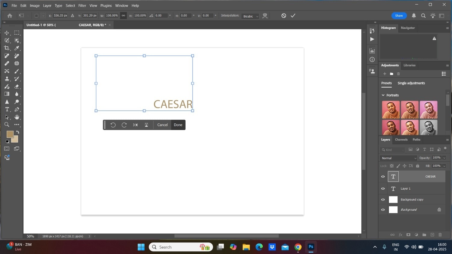 Now, you will see a boundary box with handles that appear around your text. Click and drag outside the box to rotate the text freely using Photoshop's Rotate feature.