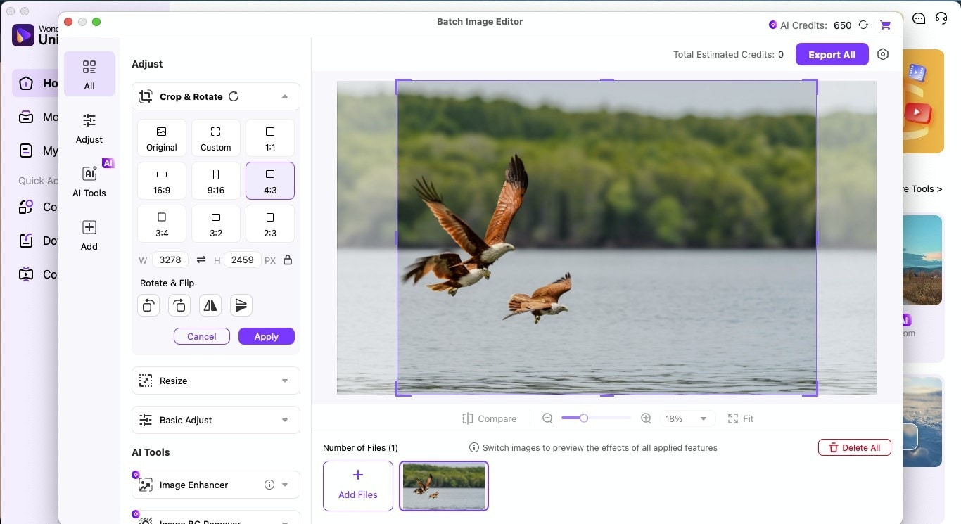 After rotating the image, you can resize, crop, remove the background, and enhance it. Once the editing is done, to save the final results, click the "Export All" option in the upper-right corner.